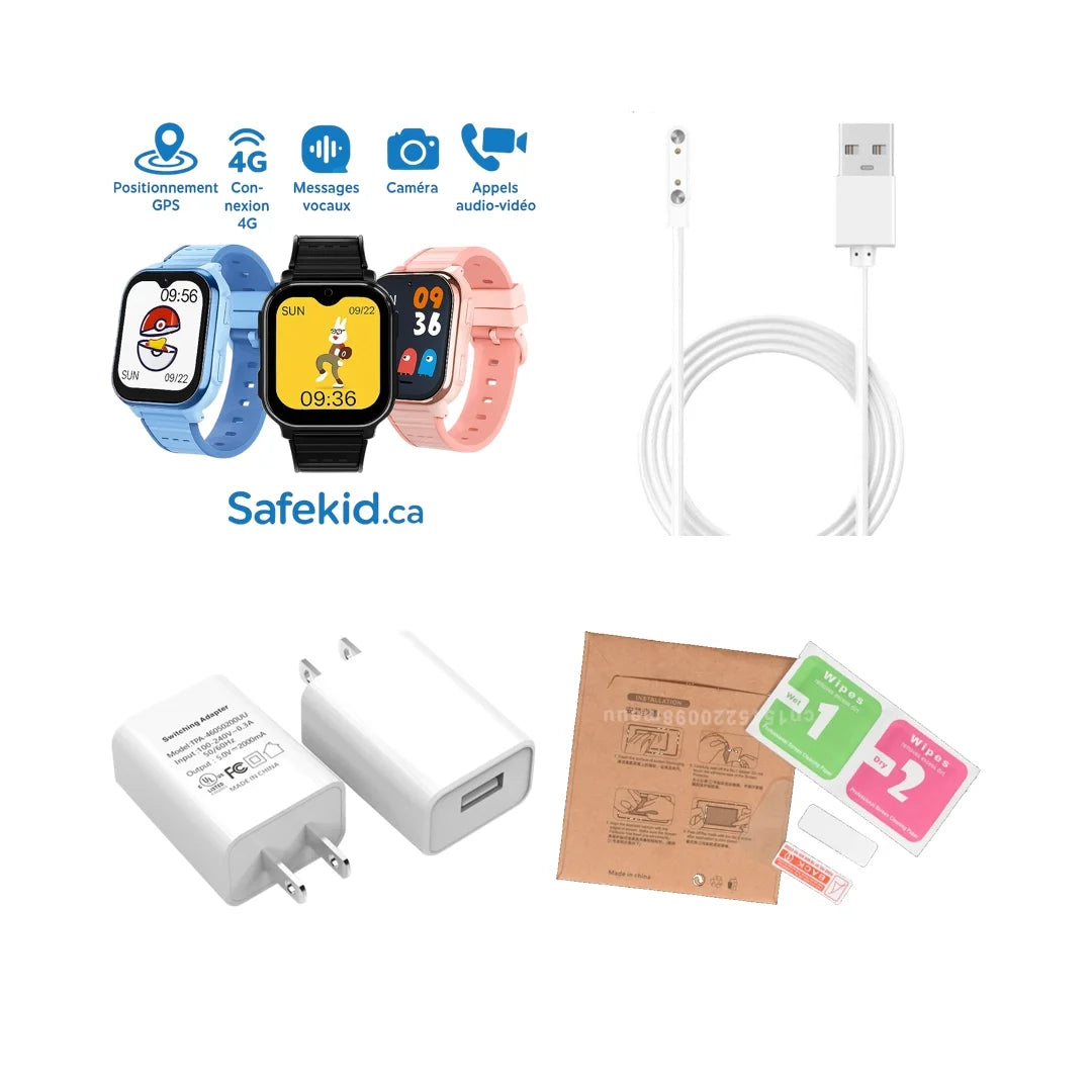 Profitez d'un rabais important en achetant tous les accessoire nécessaire pour utiliser la montre Safekid de bonne façon. Vous aurez un câble de rechange, un adapteur USB et un kit de 2 protecteurs d'écran en verre trempé.